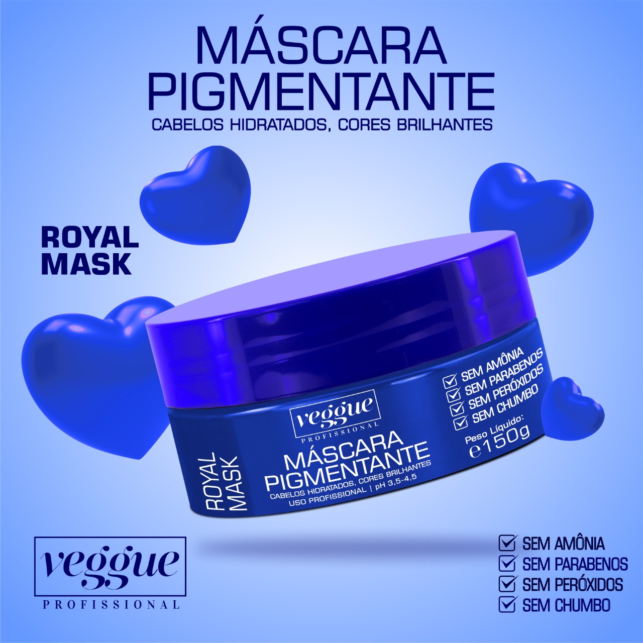 A Royal Mask Veggue Profissional foi desenvolvida especialmente para reavivar e tonalizar os cabelos com tons azul royal e descoloridos. Sua fórmula é enriquecida com Keratina e óleo de argan, nutre e fortalece profundamente os fios hidratando e dando um efeito azul royal brilhante. Possui proteção antioxidante, que evita o desbotamento e ajuda a reter por mais tempo a cor nos fios.