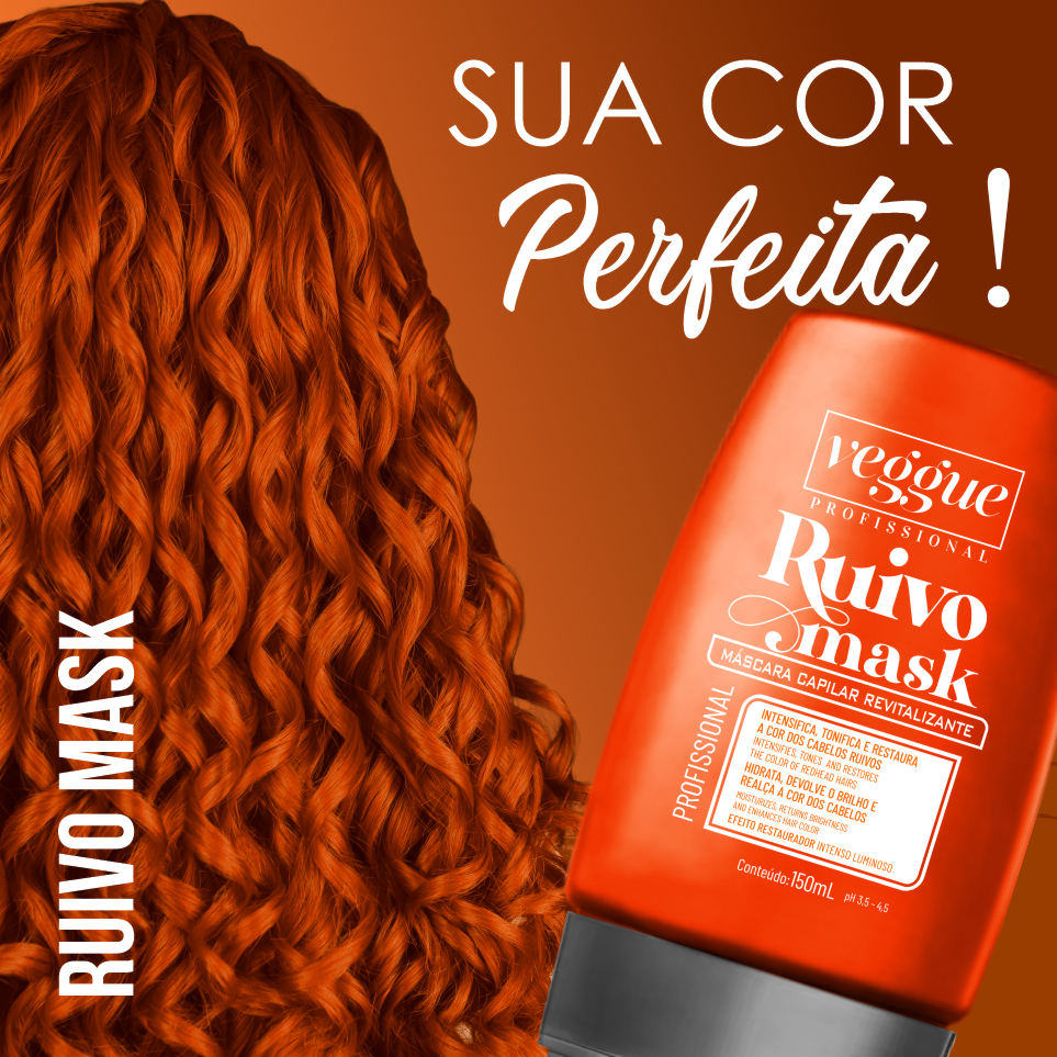 Ruivo Mask Color Veggue Profissional foi desenvolvida especialmente para pigmentar cabelos descoloridos e realçar os cabelos com tons ruivos laranja. Sua fórmula é enriquecida com Keratina e Óleo de Argan, nutre e fortalece profundamente os fios hidratando e dando um efeito marrom brilhante. Possui ação antioxidante, que evita o desbotamento e ajuda a reter por mais tempo a cor nos fios.